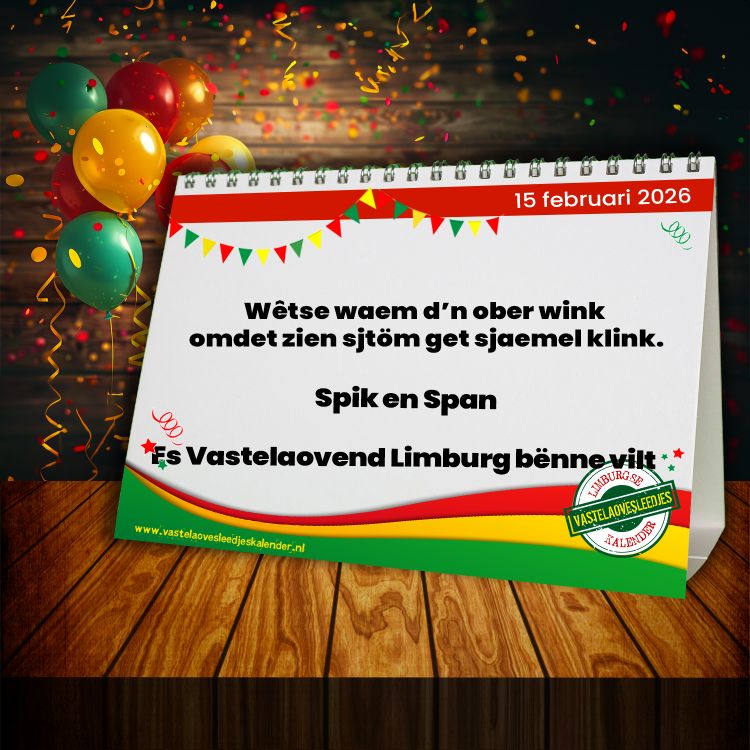 Iedere dag opnieuw verschijnt er een leuke of opmerkelijke zin uit een van de schitterende vastelaovesliedjes die ons Limburg rijk is. Laat je dagelijks verrassen. Natuurlijk is de kalender ook te volgen op Facebook en Instagram!