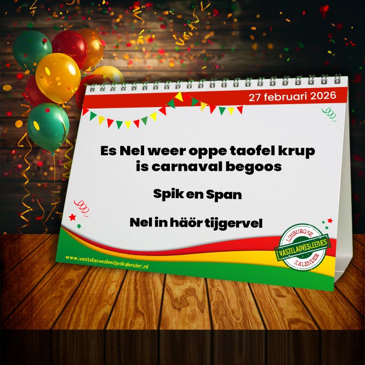 Iedere dag opnieuw verschijnt er een leuke of opmerkelijke zin uit een van de schitterende vastelaovesliedjes die ons Limburg rijk is. Laat je dagelijks verrassen. Natuurlijk is de kalender ook te volgen op Facebook en Instagram!