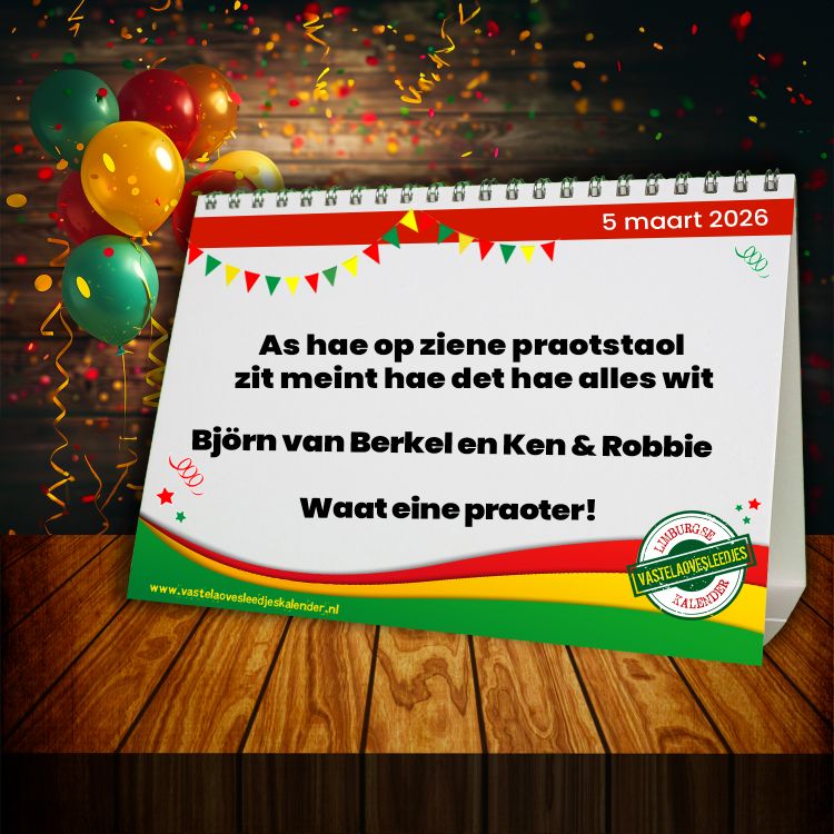 Iedere dag opnieuw verschijnt er een leuke of opmerkelijke zin uit een van de schitterende vastelaovesliedjes die ons Limburg rijk is. Laat je dagelijks verrassen. Natuurlijk is de kalender ook te volgen op Facebook en Instagram!