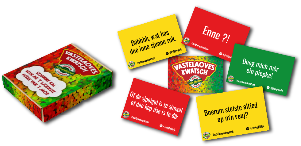 Vastelaoveskwatsch is een set van 32 kaarten die elke Vastelaovesvierder makkelijk mee kan namen naar het Vastelaovesfeest. Op elke kaart staat een zin uit een Vastelaovesliedje die tevens gebruikt kan worden om op een ludieke wijze het gesprek aan te gaan. De Vastelaovend gaat naast joeksigheid ook om samen te vieren, onbevangen in contact komen met nieuwe ‘gekke’.